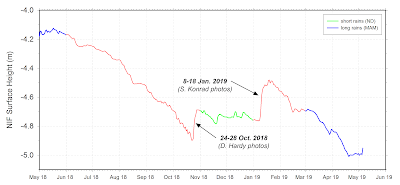 Fig. 12 (above): Upper Kersten Glacier, October 2017; find the weather station. Zoom in, as this is a panorama. Then find the relatively thick, clean stratum and compare it's position to that in 2023 (next image).
