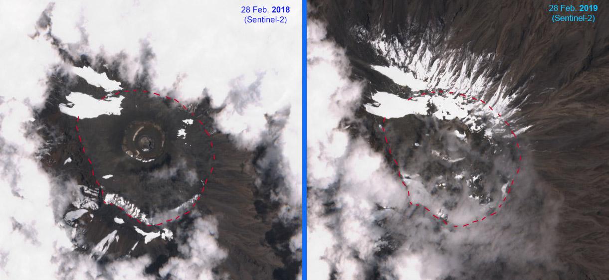 Fig. 6 (above): Mike and Emily above Karanga Camp. Kersten Glacier remnants are visible above Mike, and the Rebmann Glacier is above Emily; between them is the vanishingly meager Decken Glacier ice.