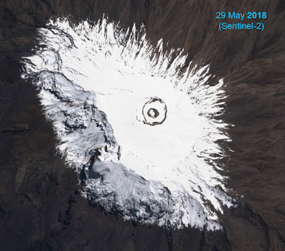 Fig. 1 (above): Kibo and 5,000 meters of relief, from Moshi. Preparing to head up again was very exciting, first time in over 3 years!