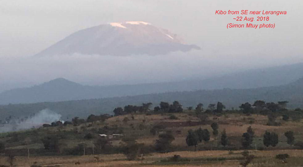 Above is a view of Kibo from Moshi just after 7 am on 28 May (Simon Mtuy credit), after a long period in which the mountain was shrouded in clouds. Snowcover has changed little since March.